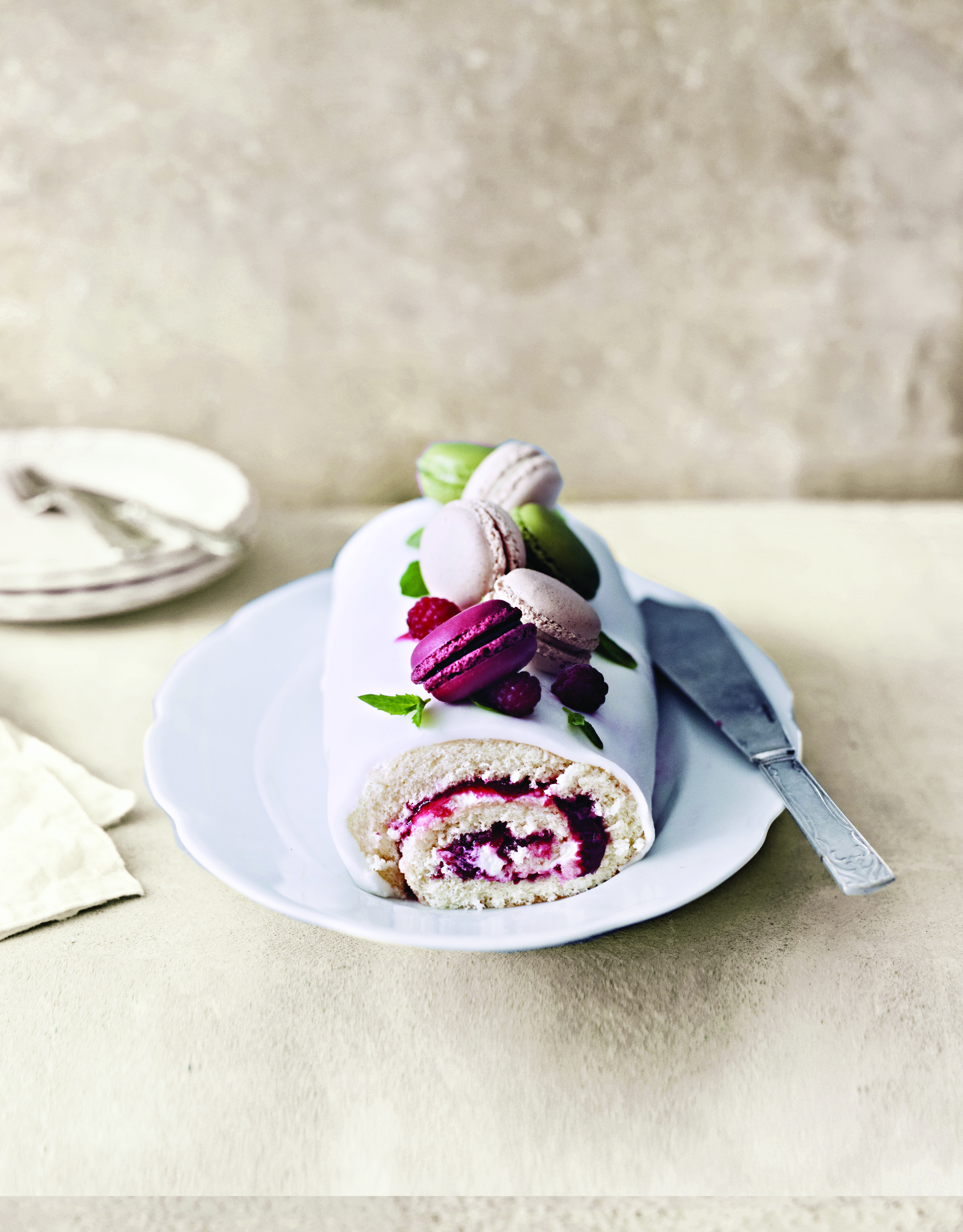 Biskuitrollen sind im Handumdrehen zubereitet, denn sie brauchen nur eine sehr kurze Zeit im Ofen. Das Besondere an diesem Exemplar ist sein elegantes Gewand aus Marzipan und seine Verzierung mit bunten Macarons, die wie kleine Schmuckstücke obenauf drapiert werden.